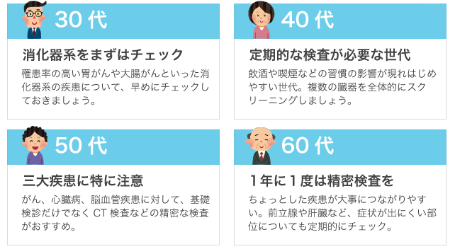 會社の健康診斷は、生活習慣病リスクに関する検査が中心で、より総合的に検査するには人間ドックを受けた方が良いです。また、人間ドックは、大きく分けて「基礎ドック」と「専門ドック」に分かれており、三大疾患など死亡リスクが高いものをカバーするには「基礎ドック」プラス「専門ドック」を受診した方が良いです。